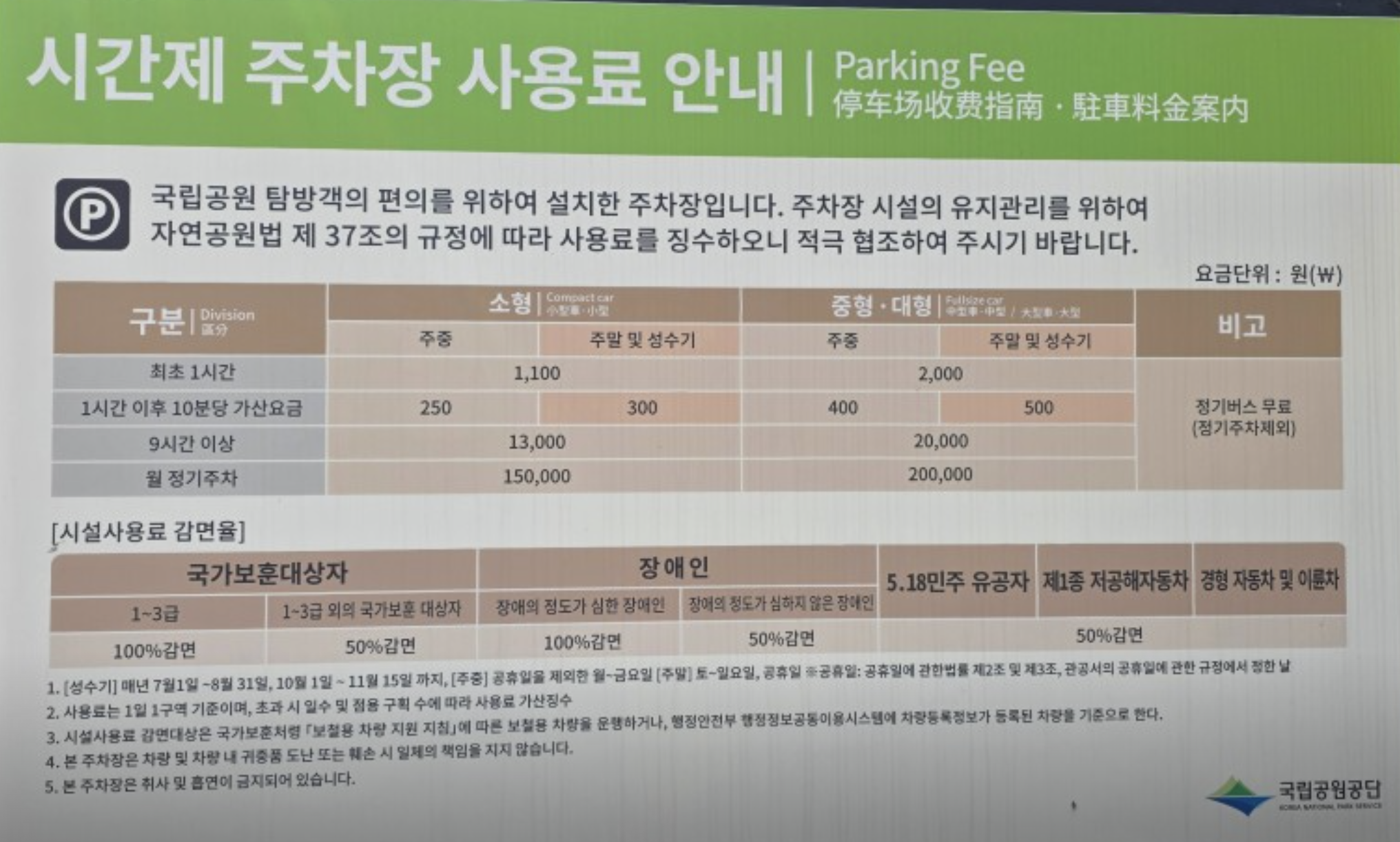 - 북한산성 제1, 2 주차장: 주차 공간이 우이동 쪽보다는 훨씬 여유롭습니다. 유료로 운영되며, 주말에는 유동 차량이 많으니 가급적 오전 9시 이전 방문을 권장합니다. 주차요금 정보는 아래 첨부 참조하세요.